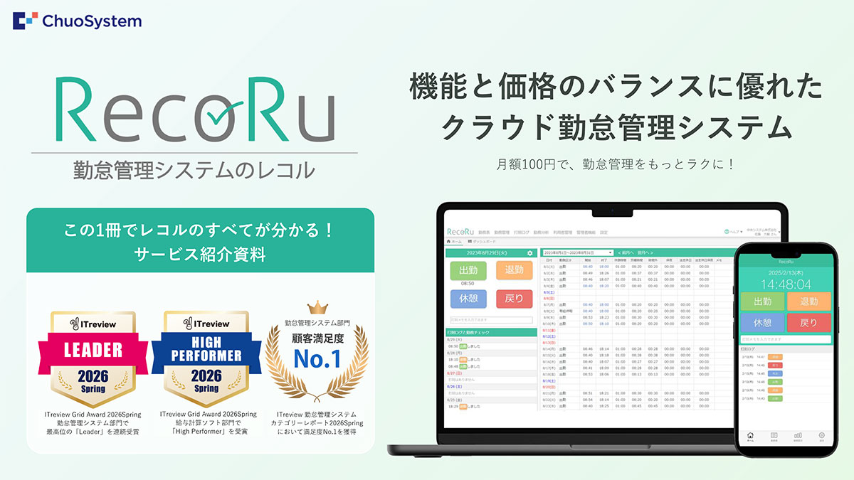 ・ランニングコストが安い。他のクラウド型勤怠システムとの比較ですが、レコルは必要十分な内容で月額100円/人なので経営的にも助かっています。