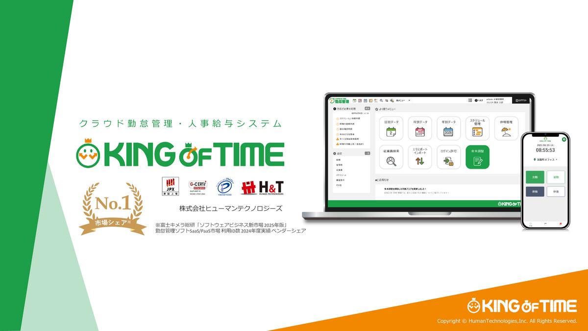 KING OF TIMEは、多彩な打刻方法と、人事給与も含めた多様な機能を備えたクラウド型の勤怠管理システムです。業種・業界に関係なく、従業員数50名以下の小規模企業から、数千名のエンタープライズ企業まで65,000社以上で利用されています。クラウド勤怠管理システムの市場ではシェアNO.1を誇り、人事給与の領域もカバーしているのが強みです。