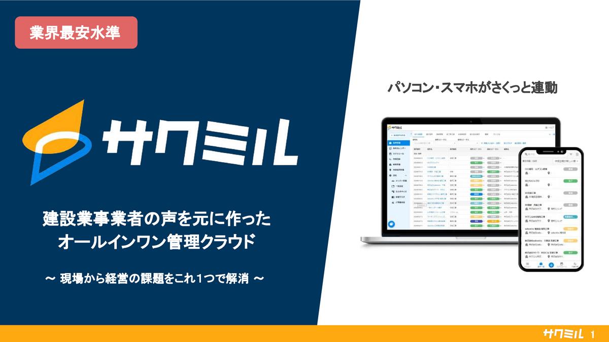 サクミルは、建設業の管理や報告書作成などの事務作業、現場作業を一元管理・効率化するクラウドサービスです。