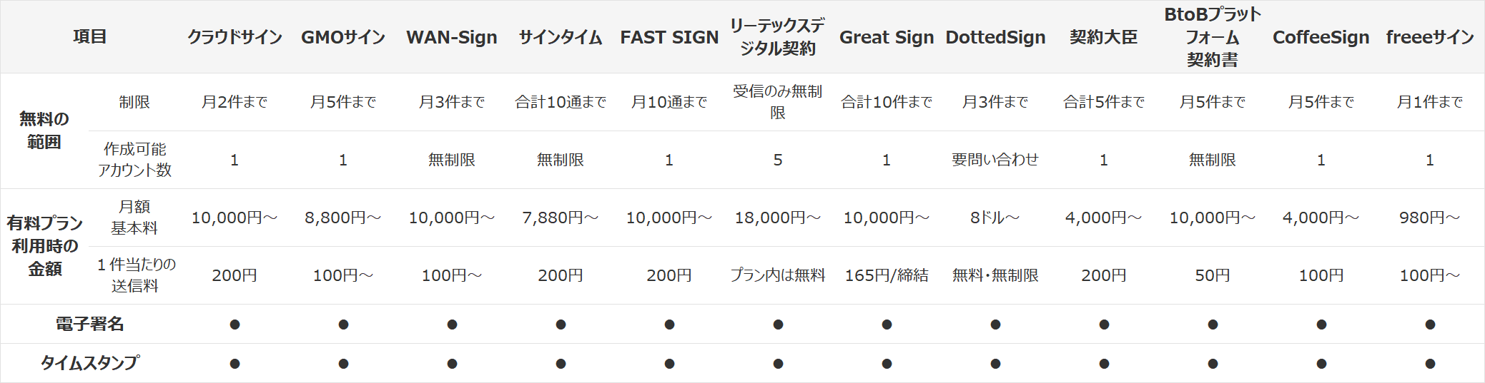 電子契約に最低限必要な機能である、「電子署名」や契約が行われた時刻などを証明して改ざんを防止する「タイムスタンプ」といった機能を、無料もしくは安価で提供しているサービスを以下の表にまとめました。