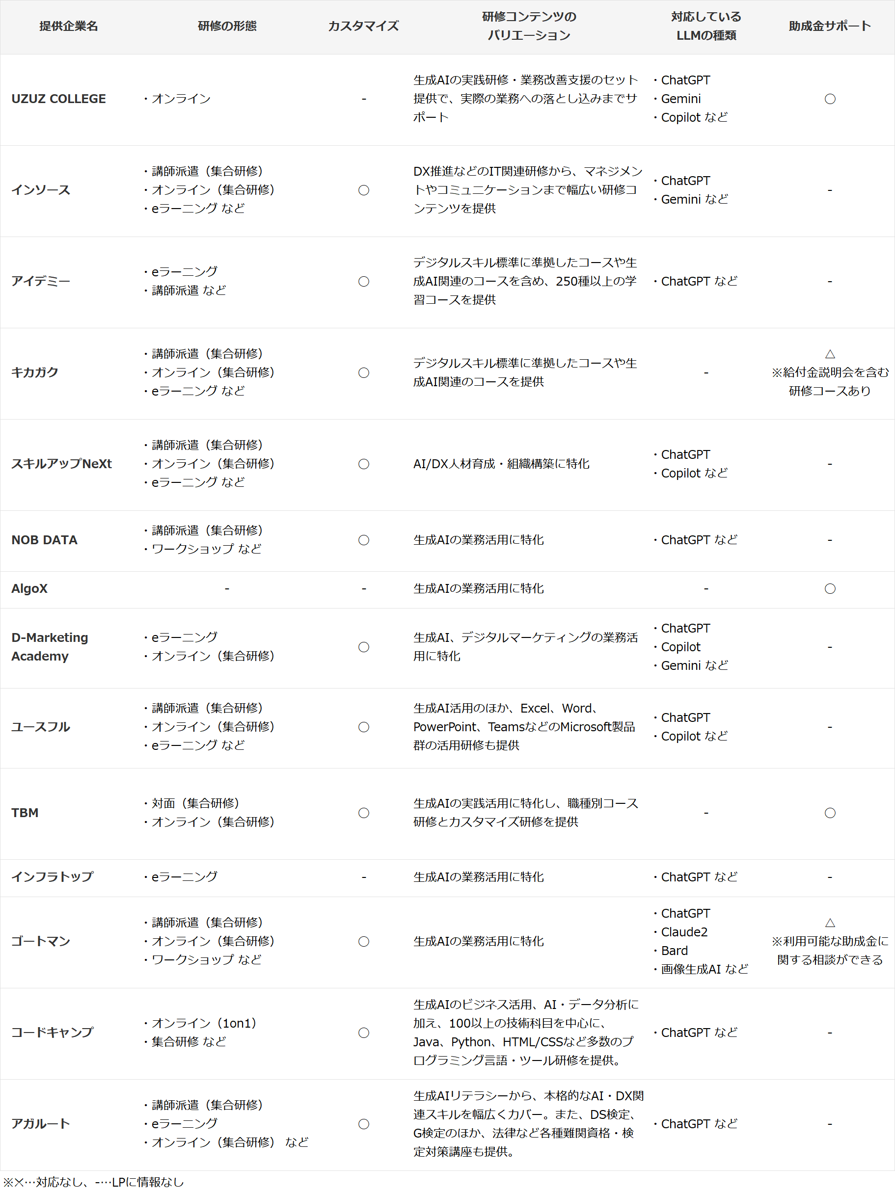 多くのAI研修は複数のLLMに対応していますが、中には特定のLLMに特化した研修もあります。導入済みもしくは導入予定のAIツールがある場合は、それらに対応しているかどうか確認しておきましょう。