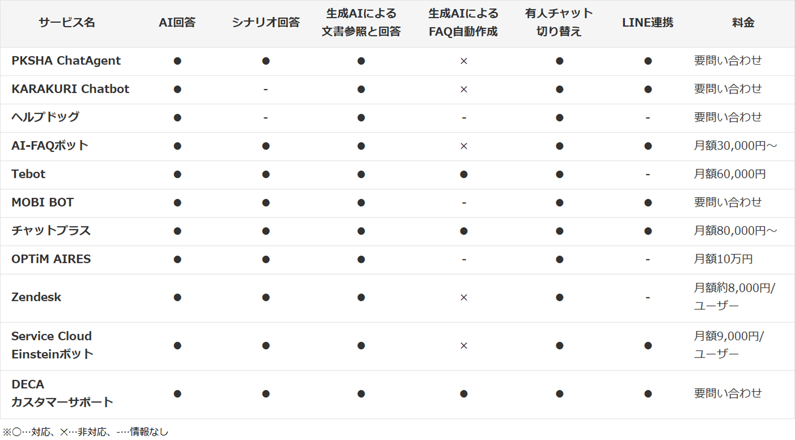FAQ向けチャットボットの対応機能を下記の一覧表にまとめました。サービスによって対応している機能が異なるため、自社に必要な範囲を把握しておきましょう。