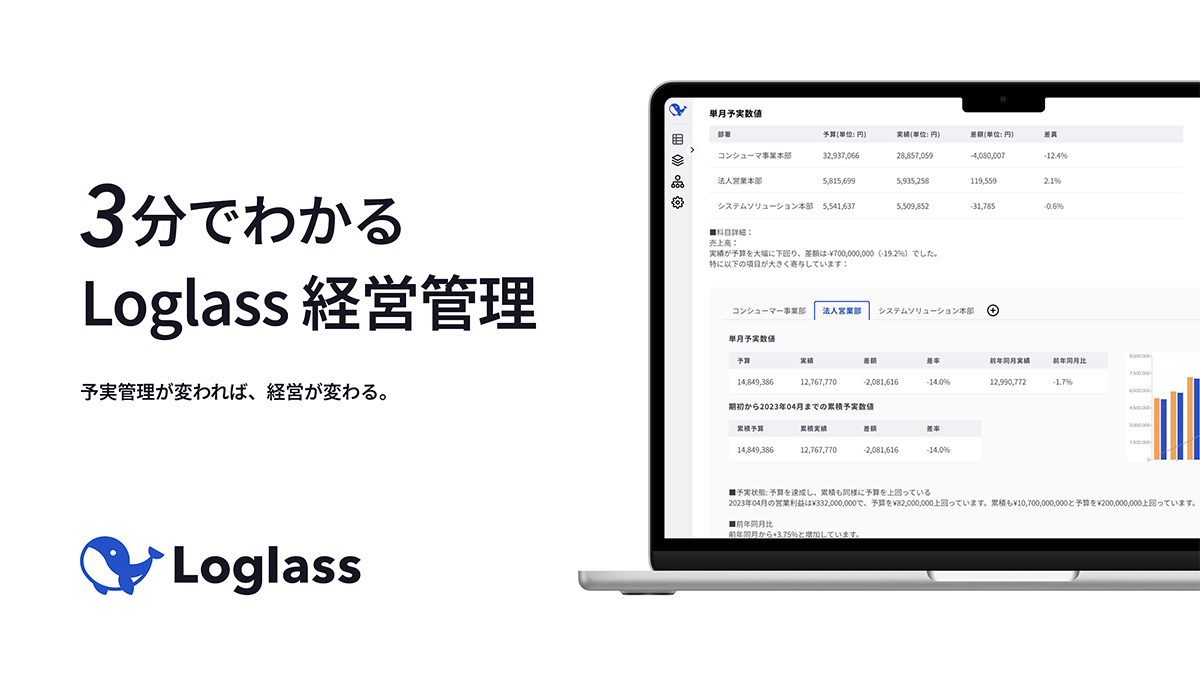 Loglass 経営管理は、経営データを正確かつ迅速に可視化・分析することで、柔軟で高精度な事業推進を実現する経営管理クラウドサービスです。経営管理クラウド市場において、累計導入社数 No.1(2024年4月時点)の実績があります(※)。
