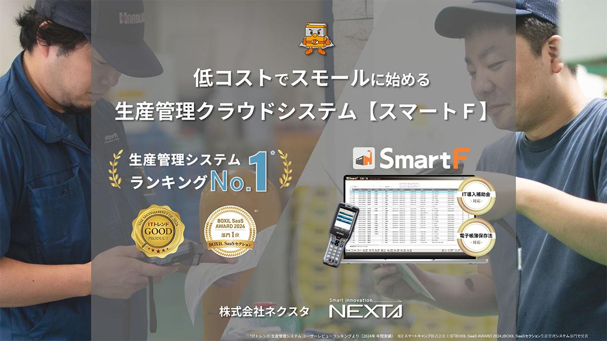 スマートFは、自社に必要な機能だけを選んでスモールに導入できる製造業向けの生産管理システムです。一部の部署・工程・業務に絞ったスモールスタートからDX化を進めたい企業におすすめです。