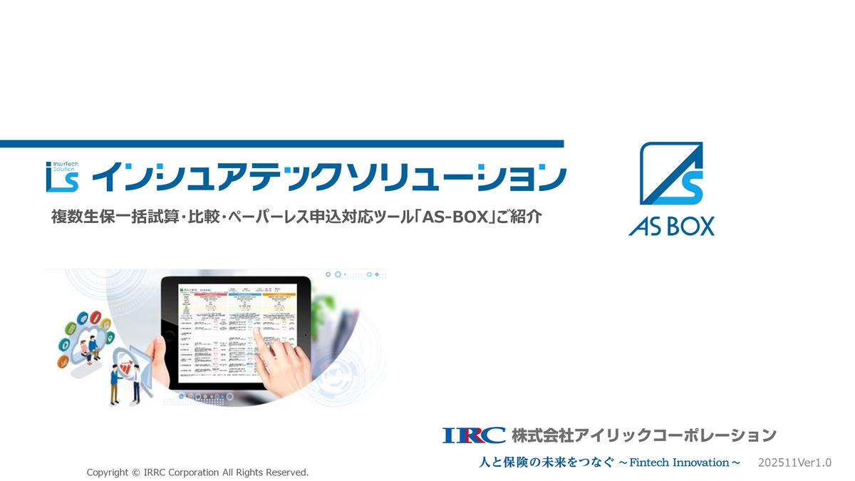 AS-BOXは、来店型保険ショップ「保険クリニック」を全国展開する同社が開発した生命保険商品提案システムです。生命保険商品の検索・比較から、意向把握や申込・ライフプラン・証跡管理まで、生命保険募集業務を効率化するための機能を豊富に搭載しています。