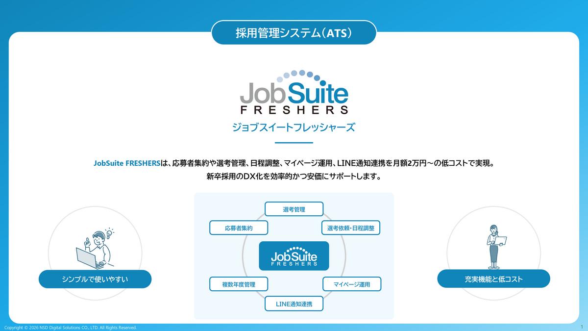 ジョブスイートフレッシャーズは、企業の新卒採用における「応募情報の集約」「選考状況の見える化」「情報共有」などを可能にする、新卒特化型の採用管理システムです。