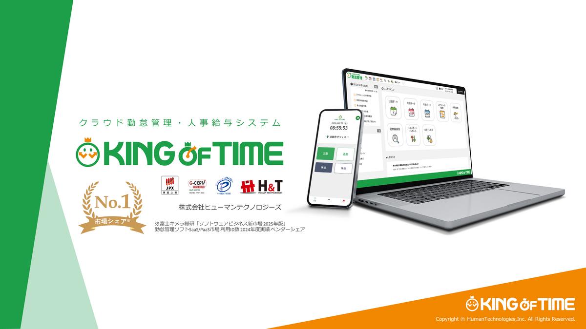 KING OF TIMEは、多彩な打刻方法と、人事給与も含めた多様な機能を備えたクラウド型の勤怠管理システムです。業種・業界に関係なく、従業員数50名以下の小規模企業から、数千名のエンタープライズ企業まで65,000社以上で利用されています。クラウド勤怠管理システムの市場ではシェアNO.1を誇り、人事給与の領域もカバーしているのが強みです。