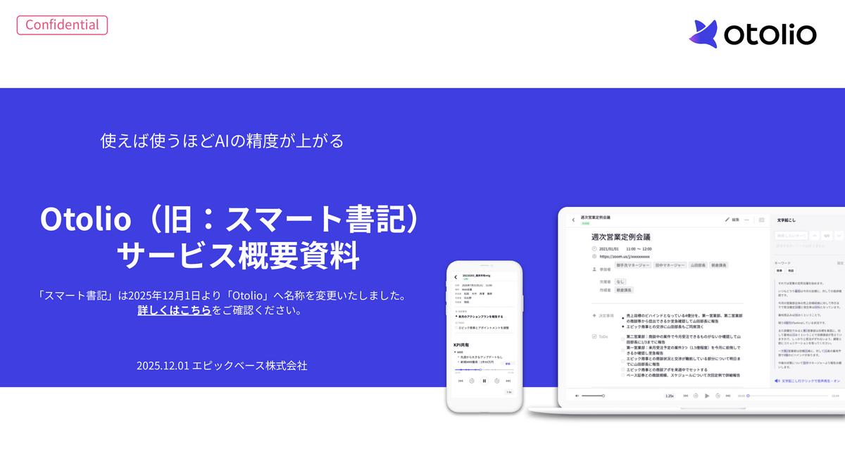 Otolioは、議事録などのあらゆるドキュメント作成に関する作業を自動化・効率化するAI議事録サービスです。特許取得の独自アルゴリズムで使えば使うほどAI精度が向上する仕組みを提供していて、AIに機密データを学習させることなく、社内の専門用語・固有名詞の認識精度が向上し続けることができます。そのため、セキュリティを保ちながら議事録作成時間を最大90%以上削減を実現します。また、議事録作成時間の削減だけではなく、音声を活用することによる正確な情報共有、管理工数の削減も可能になっています。