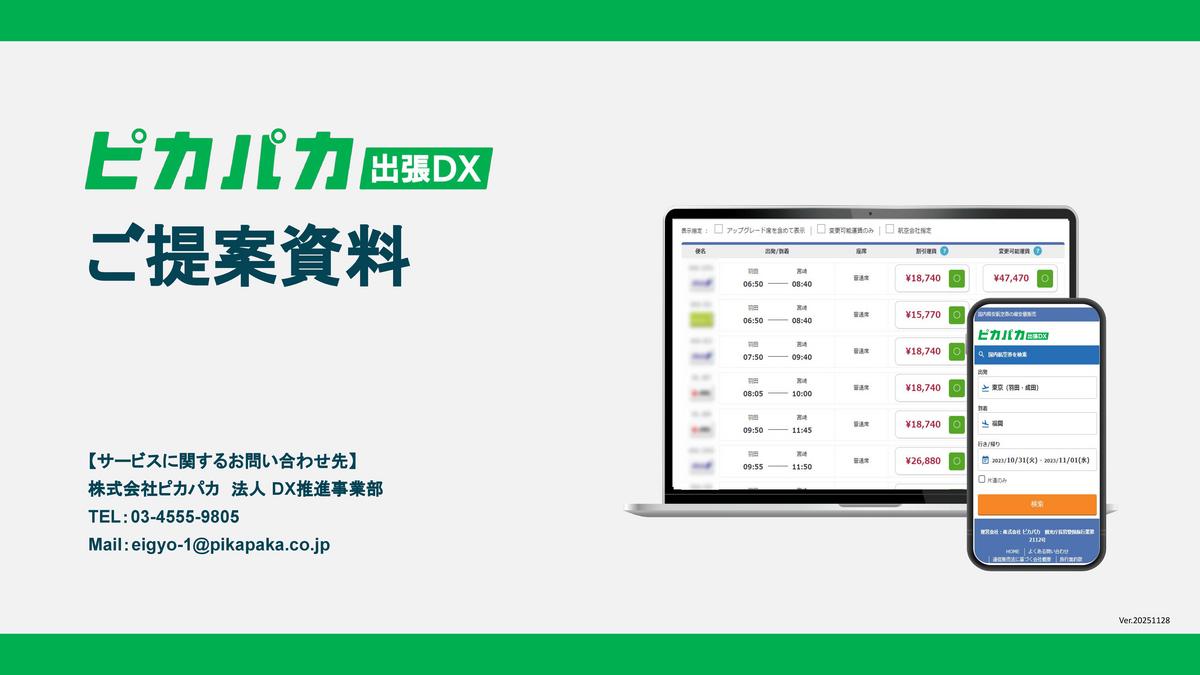 ピカパカ出張DXは、国内外の出張手配を効率化し、立替精算の手間を削減できる出張管理システムです。東証プライム上場企業である株式会社エアトリの法人部門から分社化してできた、株式会社ピカパカが提供しています。