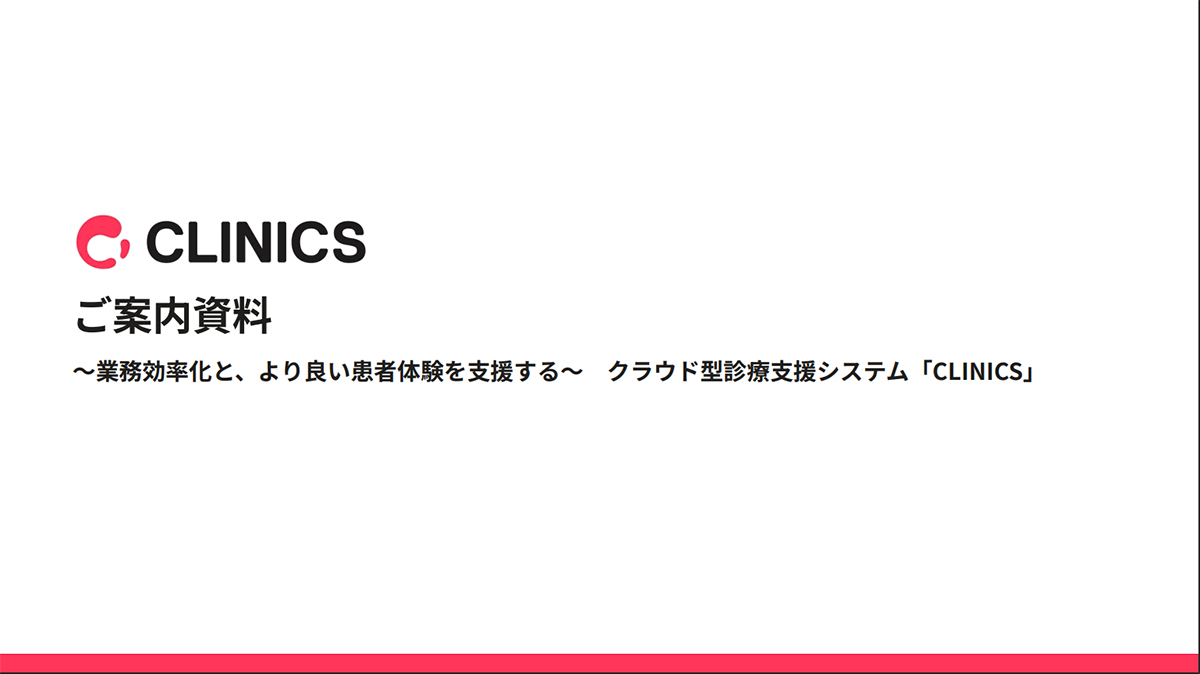 CLINICSは、オンライン診療システム導入実績No.1*のメドレーが開発・提供する、予約〜受付〜診察〜会計業務まで医療機関と患者がスムーズにつながる仕組みを実現したクラウド電子カルテです。臨床医とデザイナーの目線で徹底的にこだわった使いやすいUIも強み。