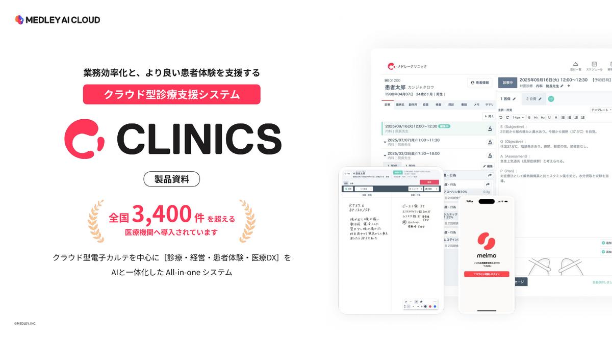 CLINICSは、予約から電子カルテ、レセプトチェック、経営分析まで、クリニックの業務プロセス全体をシームレスに支援するクラウドシステムです。搭載されたAI技術が、煩雑な作業を効率化することで「医師が診療に集中できる環境」を創出。更に、経営分析機能が「データに基づいた的確な経営判断」をサポートし、当該医療機関の持続的な成長と安定経営に貢献します。