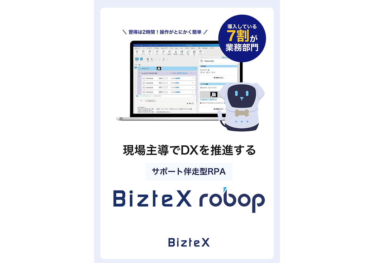 BizteX robopは、プログラミングの専門知識不要で、約2時間で基本操作をマスターできるデスクトップ型RPAです。