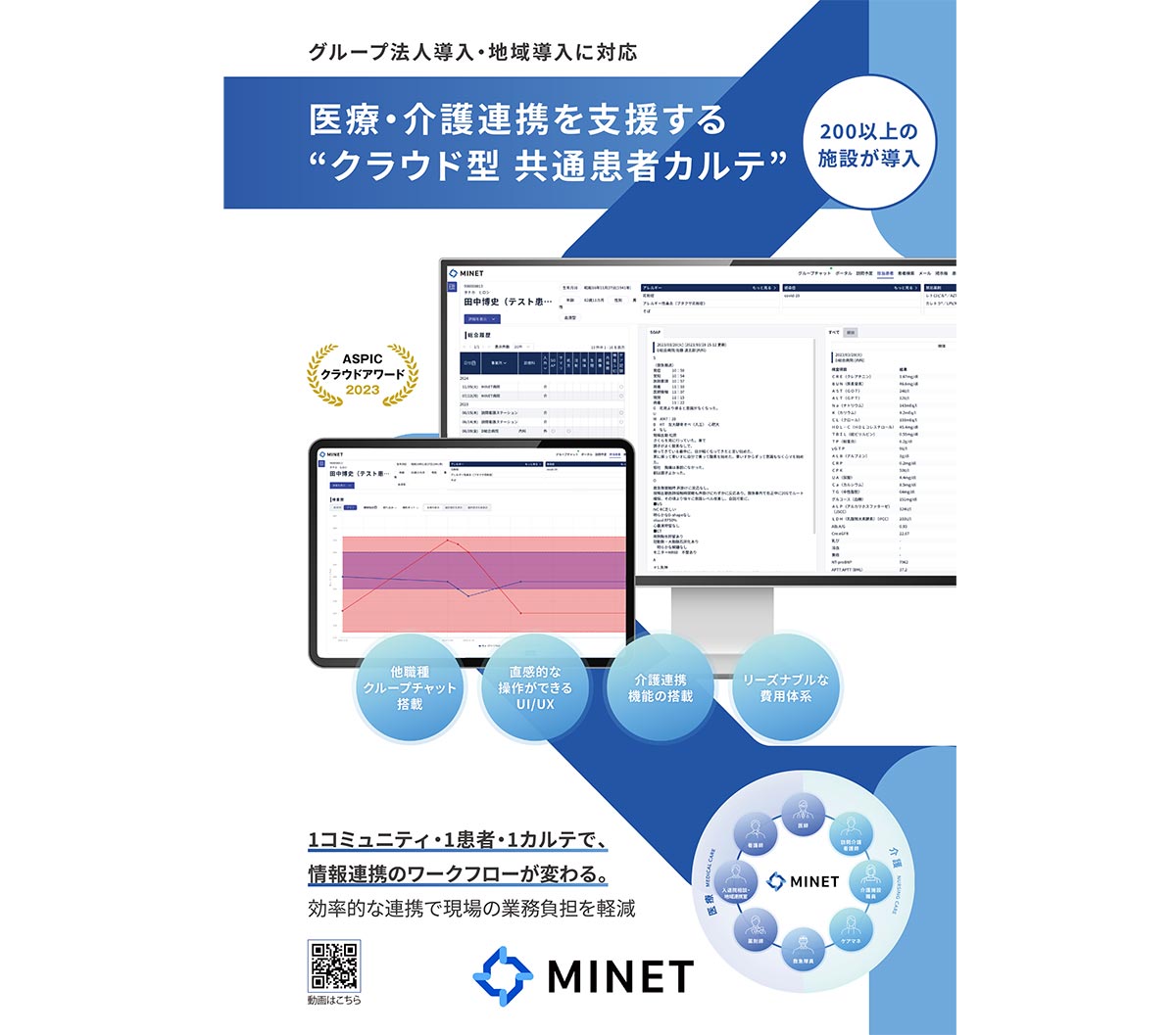 MINET(ミネット)は、医療・介護現場における情報連携を支援するクラウド型医療介護連携システムです。電子カルテや調剤レセプト、介護システムから患者情報を15分ごとに自動収集し、複数施設にまたがる診療歴・検査結果・画像データなどを一元的に統合。電話やFAXによる煩雑なやり取りを削減し、紹介・逆紹介や入退院調整の効率化を実現します。