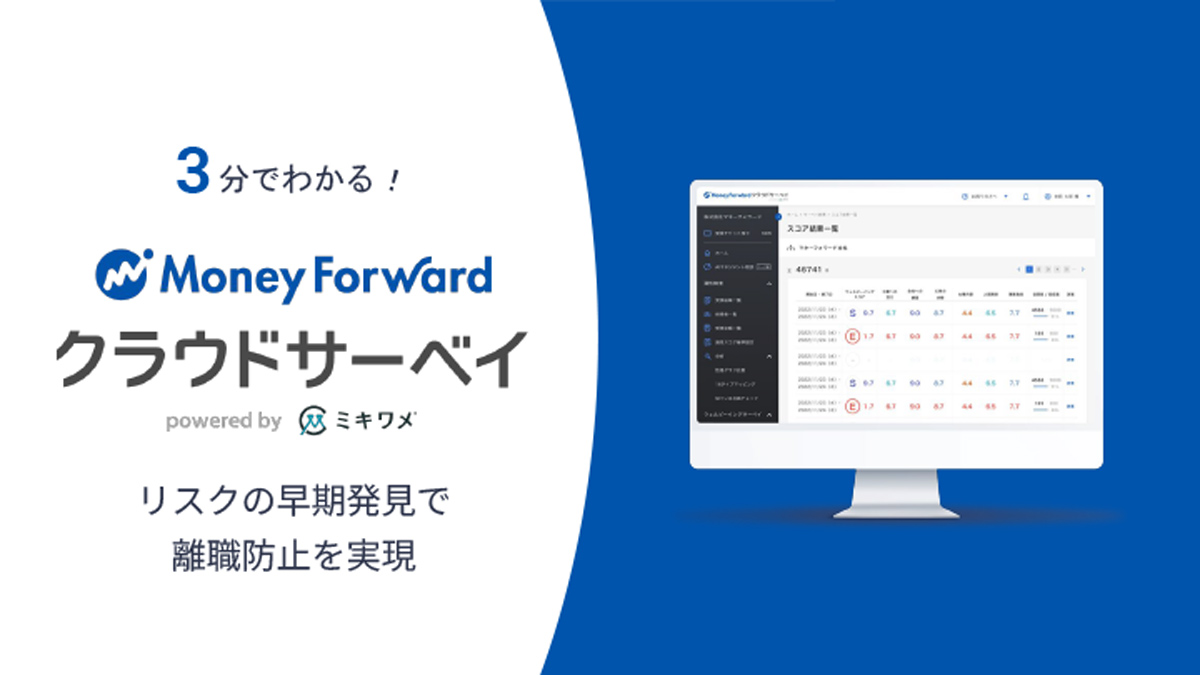 マネーフォワード クラウドサーベイpowered by ミキワメは、社員の心理状態やエンゲージメントを可視化し、離職・休職リスクや組織力低下の防止をサポートするサービスです。人事・経理などバックオフィス業務の効率化や生産性向上を支援するマネーフォワードが提供しています。