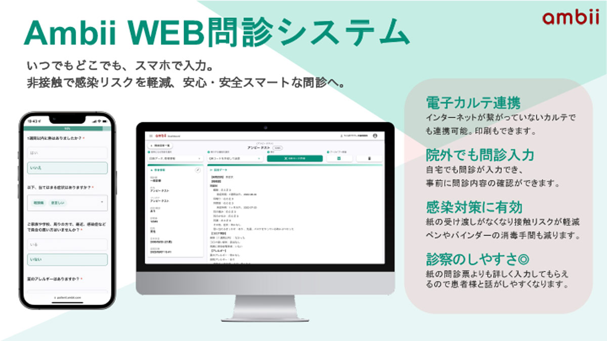 Ambii WEB問診は、転記作業の自動化に強みを持つWeb問診システムです。質問項目のカスタマイズ、診療科ごとのテンプレート、画像アップロード、多言語対応といった問診票にまつわる作業を効率化するための機能を搭載。QRコード、ホームページのリンク、SMS送信などで問診票を予め配布することで、来院前にスムーズに入力依頼が可能です。
