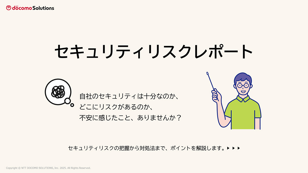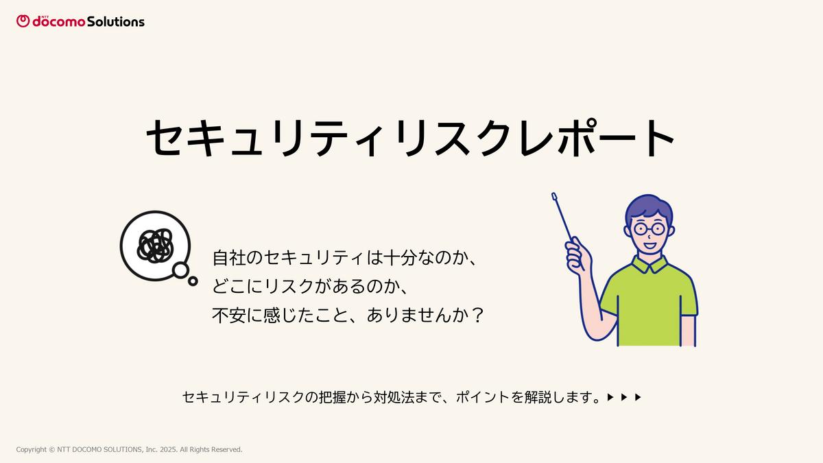 NTTドコモソリューションズが提供するセキュリティリスクレポートは、ヒアリングと業務端末の実機確認により、企業のセキュリティリスクを詳細に診断・分析するサービスです。