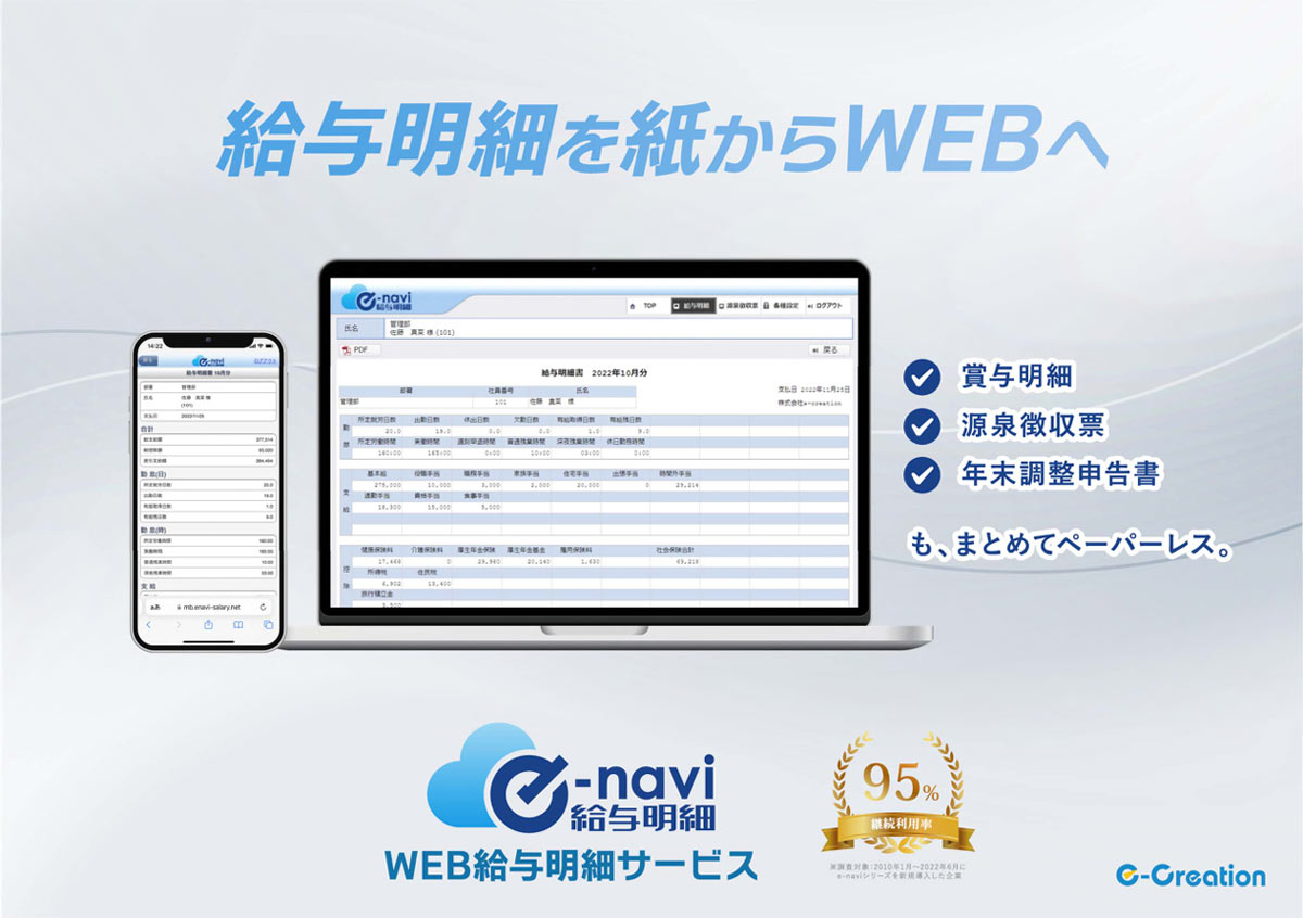 e-navi給与明細は、給与明細・賞与明細・源泉徴収票・住民税通知書など、複数の帳票を電子配付できるWeb給与明細サービスです。更に、従業員による年末調整申告書の入力にも対応しています。