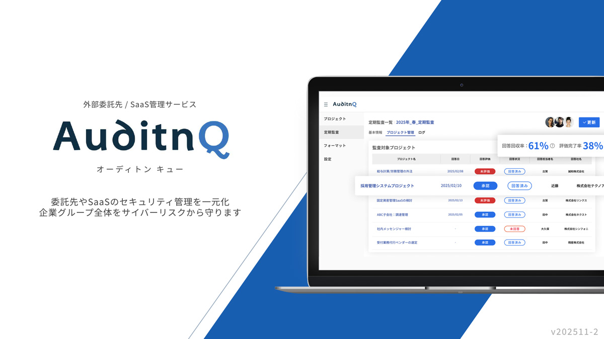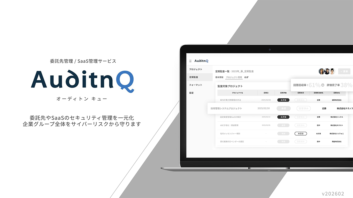 AuditnQ(オーディトンキュー)は、企業グループ全体の委託先やSaaSベンダーに対するセキュリティチェック・監査業務を効率化するクラウドサービスです。