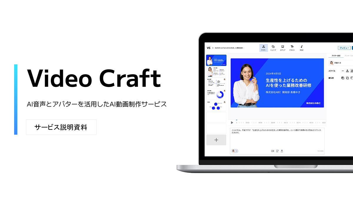 Video Craftは、AI音声とアバターを活用して、撮影なしで高品質な動画を制作できるサービスです。PDF・PowerPoint形式の資料や原稿を用意し、アップロードするだけで準備は完了。専門知識・学習がいらないスライドツールのような操作感で、テキスト・図形・画像を配置したり、アニメーションを追加したりと要素の編集が可能です。