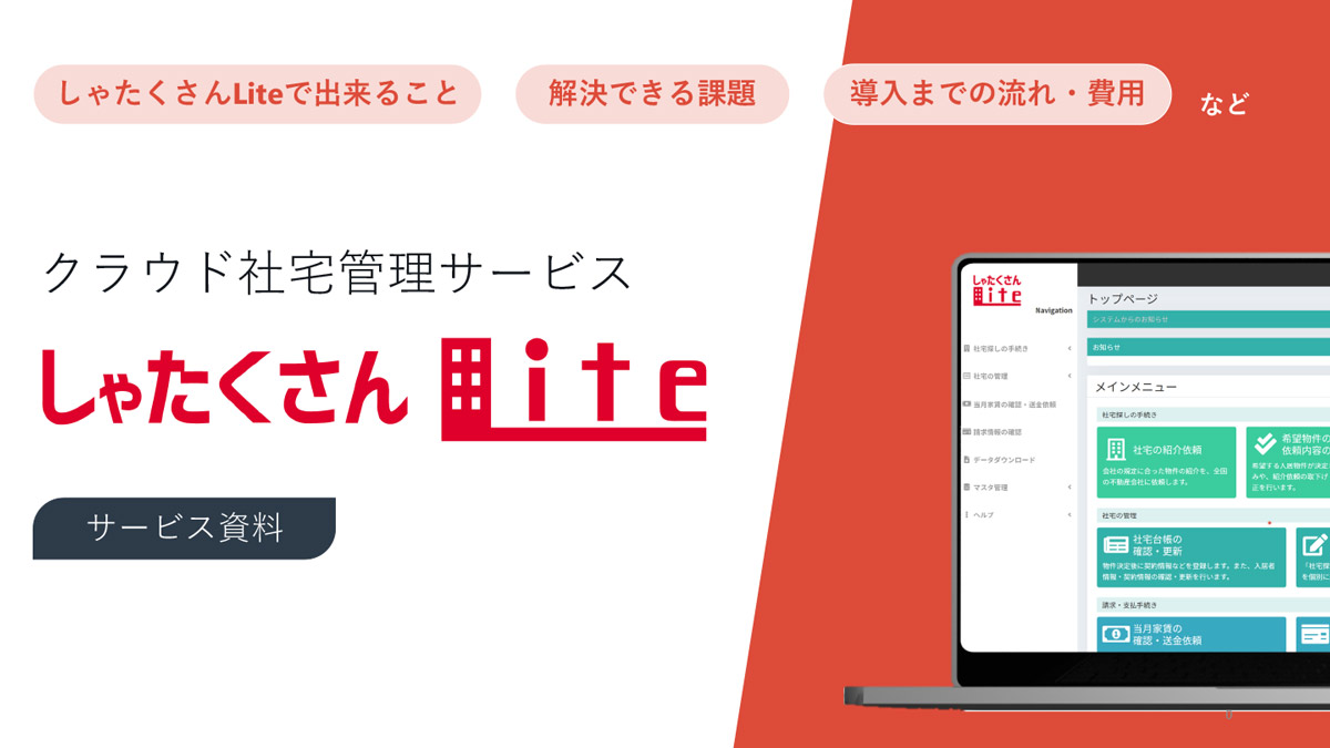 しゃたくさんLiteは、社宅管理システムと選べる代行サービスで、コストを抑えつつ業務効率化が図れるサービスです。