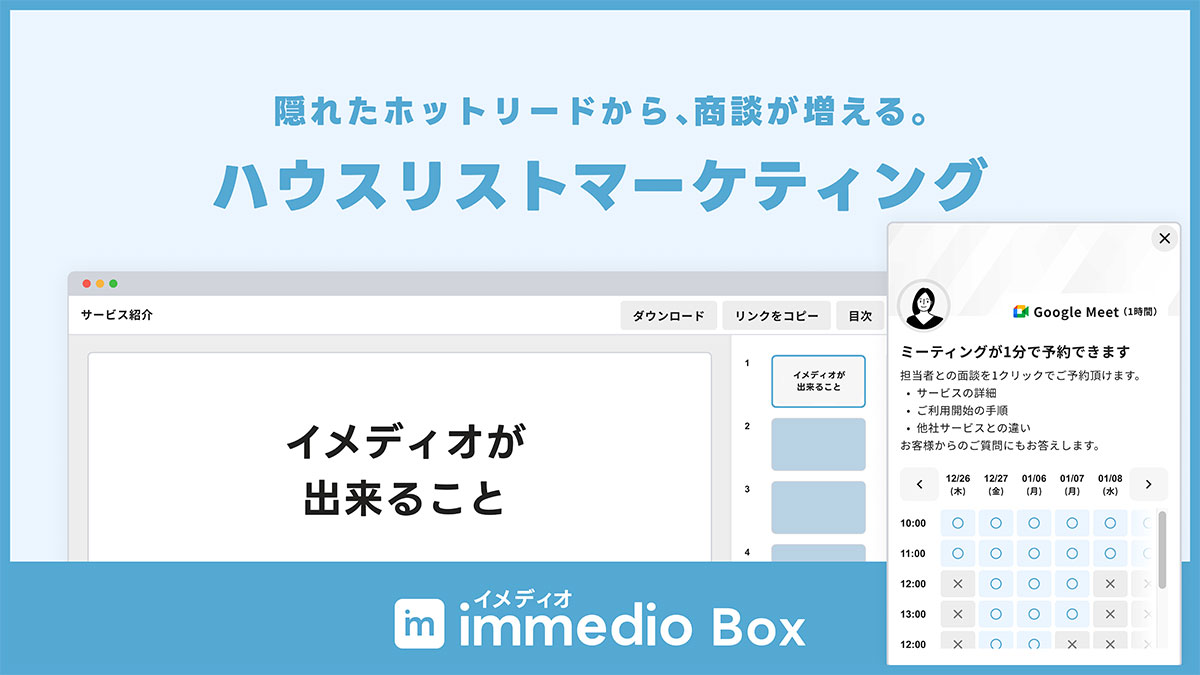 immedio Boxは、資料の閲覧状況から顧客の興味・関心度を捉え、商談を自動提案できるハウスリストマーケティング支援ツールです。