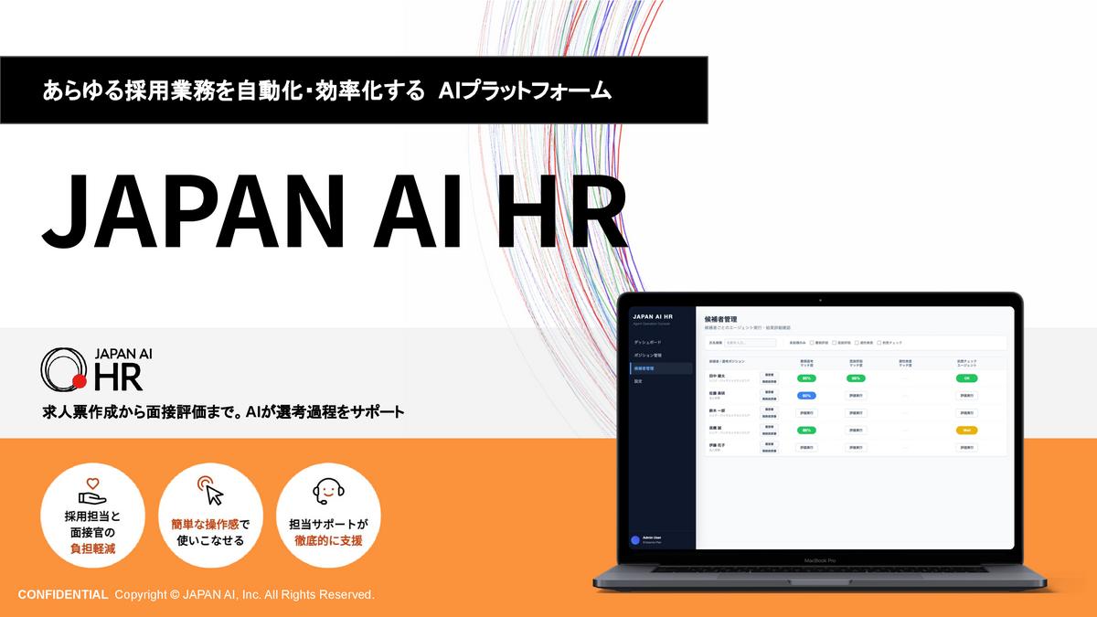 JAPAN AI HRは、定型作業の自動化と採用基準の標準化を支援する採用特化型のAIプラットフォームです。求人票作成・スカウト・選考書類チェック・面接評価など、一連の採用フローにおける定型業務をAIが実行し、採用担当者と面接官の工数を削減。最終判断や候補者対応といった付加価値の高い業務に集中しやすい環境作りを支援します。