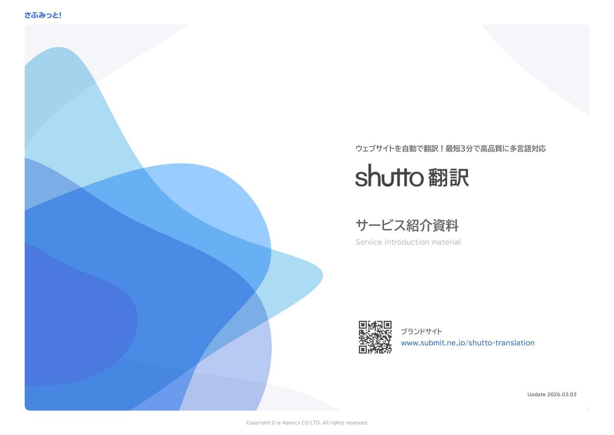shutto翻訳は、Webサイトの多言語対応を手間なく継続運用できる翻訳ツールです。コーポレートやブランド、自治体、ECサイト、管理画面など幅広いジャンルの5,500サイト以上で活用されています。1行のタグを設置するだけで導入できる手軽さが特徴で、ページ追加・更新時の翻訳を自動化してコスト・工数を削減します。導入後も専任スタッフが伴走するため、初めて多言語対応に取り組む場合でも安心です。