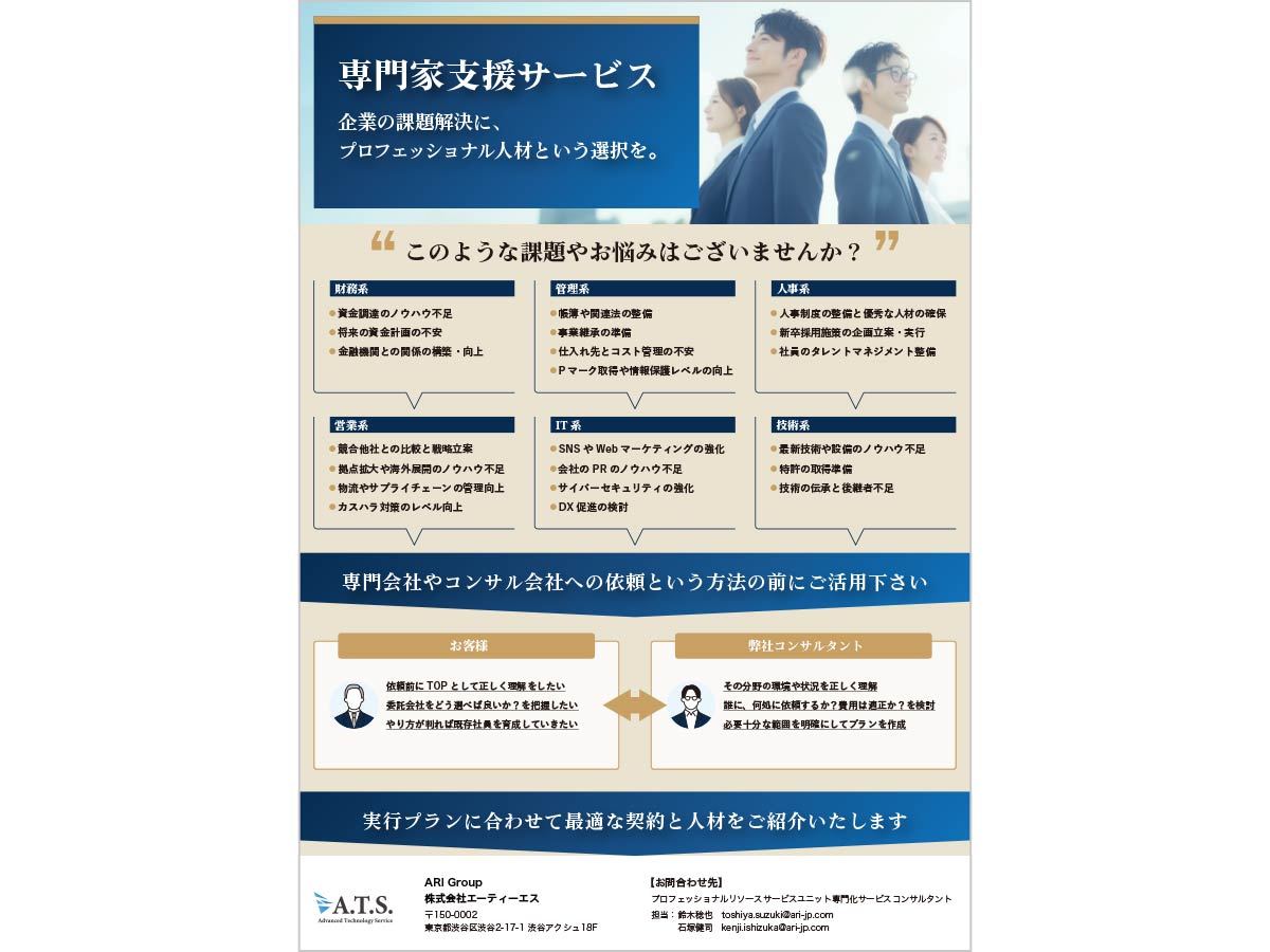 プロジェクト単位で課題解決に参画する専門家と企業のマッチングを支援するサービス。専門人材による即戦力活用で経営と現場をつなぎ、成果創出とノウハウ定着を支援します。