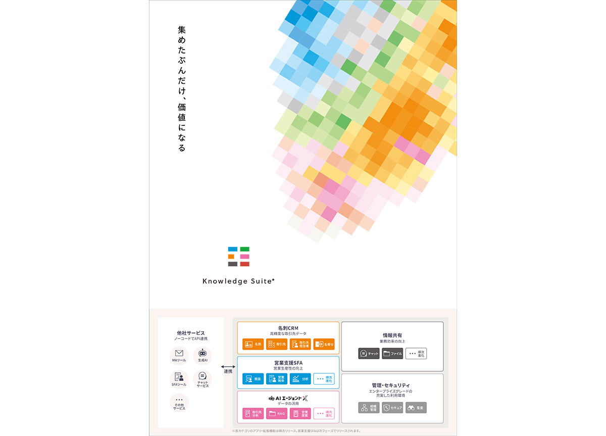 Knowledge Suite+(ナレッジスイートプラス)は、高精度な名刺取り込みとデータ連携で、「使える顧客データベース」を構築できる名刺・取引先管理CRMプラットフォームです。