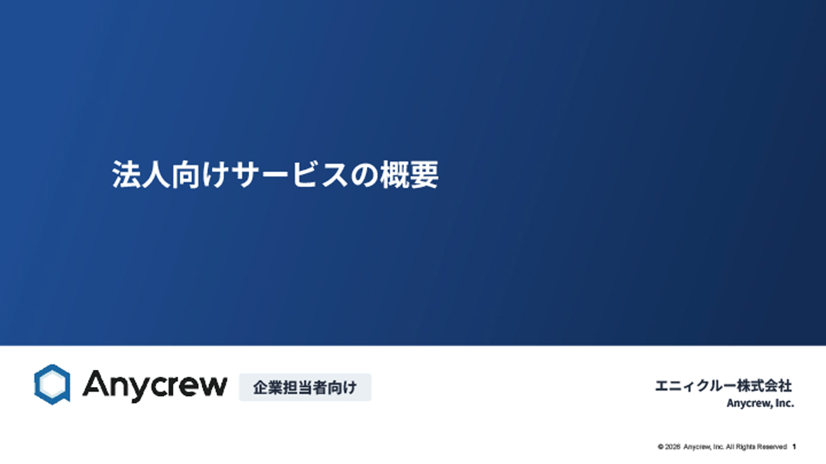 Anycrewエージェントは、コストを抑えながら目的に合った顧問や優秀な人材を紹介するエージェントサービスです。Anycrewのプラットフォームに登録する15,000名以上のユーザーに加え、外部媒体も活用し、クライアントの業界・予算・規模を踏まえた人材とのマッチングを実現します。営業顧問をはじめ、マーケティングや事業開発、財務、人事など幅広い職種の顧問や即戦力人材の採用に利用できます。