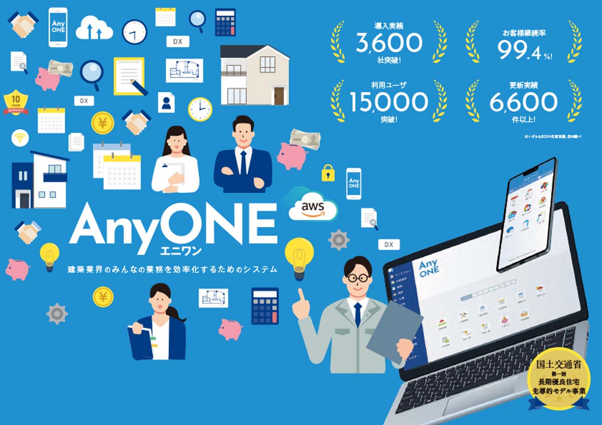 AnyONEは、建設業務に役立つ豊富な機能を一元的に搭載し、業務効率化と収益改善を両立するクラウド型基幹システムです。