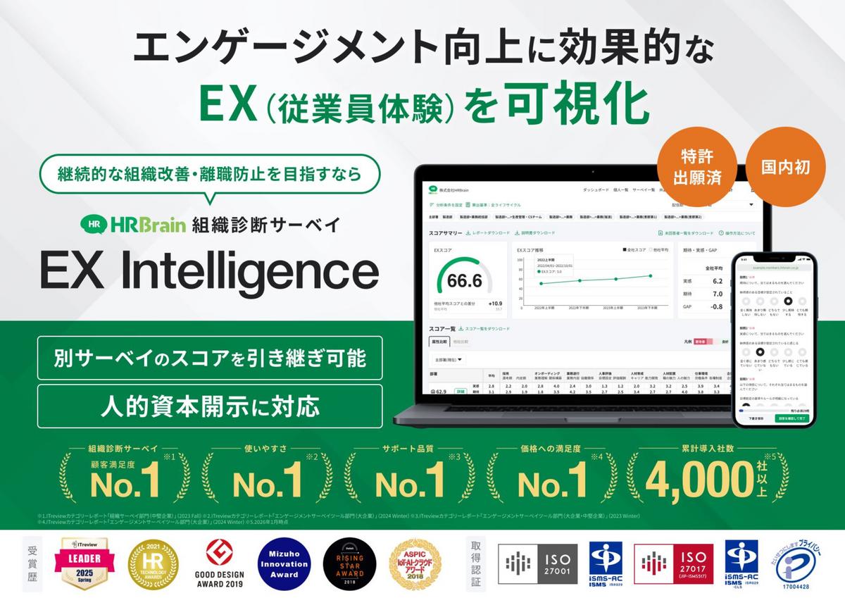 HRBrainが手掛ける、従業員エクスペリエンスにフォーカスした国内初の組織診断サーベイ(特許取得済)。組織と個人の課題を可視化し、「離職防止」や「エンゲージメント向上」を実現。