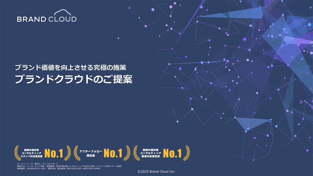 風評被害クラウドは、インターネットのネガティブ情報を可視化して、検索結果やSNSへの影響を抑える誹謗中傷 ・風評被害対策サービスです。累計500社以上の対策実績を持ち、広告・通信・金融・不動産・医療など幅広い業種に対応。AIも取り入れた独自施策を展開し、企業名や商品名などに紐づく誤情報・悪評の早期発見~抑制をワンストップでサポートします。
