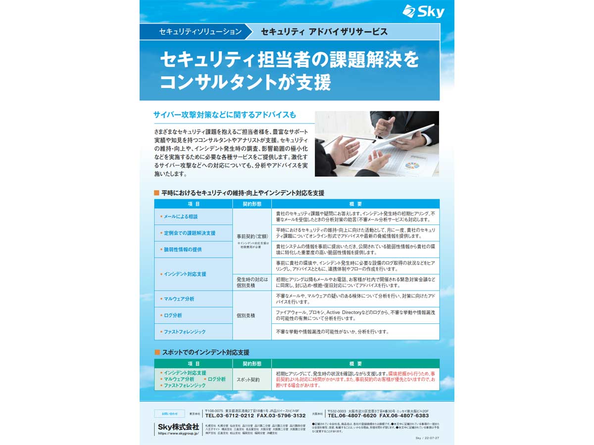 豊富な知見を持つコンサルタントが、現場担当者の課題解決を支援する「セキュリティ アドバイザリサービス」も提供しています。平常時にはメール相談や最新の脅威情報の提供を通じて、日々の運用における不安や負担を軽減。インシデント発生時には、初期ヒアリングから封じ込め・復旧までを伴走。マルウェア分析・ログ解析・ファストフォレンジックなど、専門的な手法で被害を最小限に抑えます。