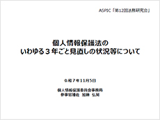 個人情報保護法の目的と制度全体の構成を確認し、法が「個人情報の有用性に配慮しつつ、個人の権利利益を保護する」基本法であることが示された。続いて、令和2年改正法の附則に基づく「3年ごと見直し」規定に沿い、政府・委員会で進められている検討の経緯と現状が説明された。
